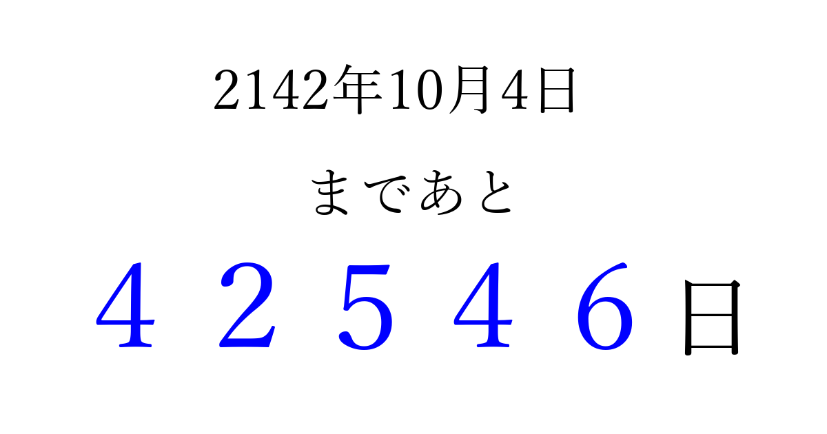 2142年10月4日(木)まで あと 99999 日です 追加すると、トップページからすぐ選べるようになります ※2026/04/09現在の結果です。 最新の状態に更新する ↓シェアして、タイムライン上にカウントダウンを表示しよう!↓ 📤 この結果を共有する Tweet シェア Threads Bluesky 別の日付でカウントダウン 2142年10月のカレンダー このページをブックマークに追加すると、いつでもカウントダウンを確認できます。 (PC: Ctrl+D / Mac: ⌘+D) hitome-notes.comでは以下のページも運営しています。 指定日と期間から日付を計算 | ガチャ確率計算・シミュレーション | プライバシー・ポリシー 運営者:Avocado