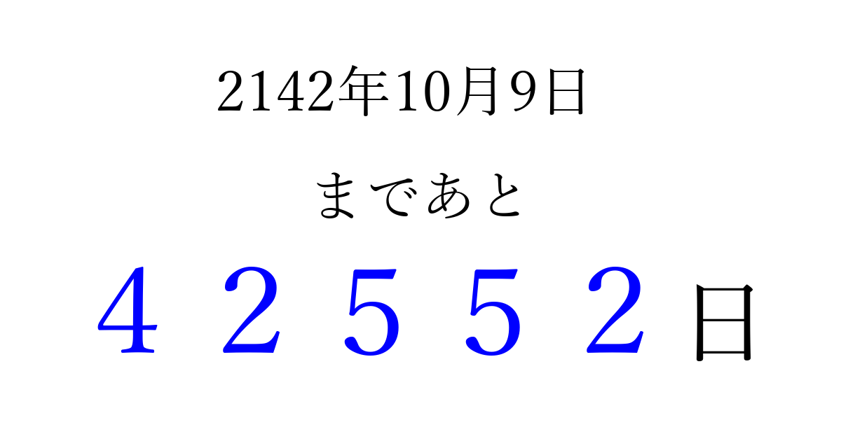 2142年10月9日(火)まで あと 99999 日です 追加すると、トップページからすぐ選べるようになります ※2026/04/08現在の結果です。 最新の状態に更新する ↓シェアして、タイムライン上にカウントダウンを表示しよう!↓ 📤 この結果を共有する Tweet シェア Threads Bluesky 別の日付でカウントダウン 2142年10月のカレンダー このページをブックマークに追加すると、いつでもカウントダウンを確認できます。 (PC: Ctrl+D / Mac: ⌘+D) hitome-notes.comでは以下のページも運営しています。 指定日と期間から日付を計算 | ガチャ確率計算・シミュレーション | プライバシー・ポリシー 運営者:Avocado