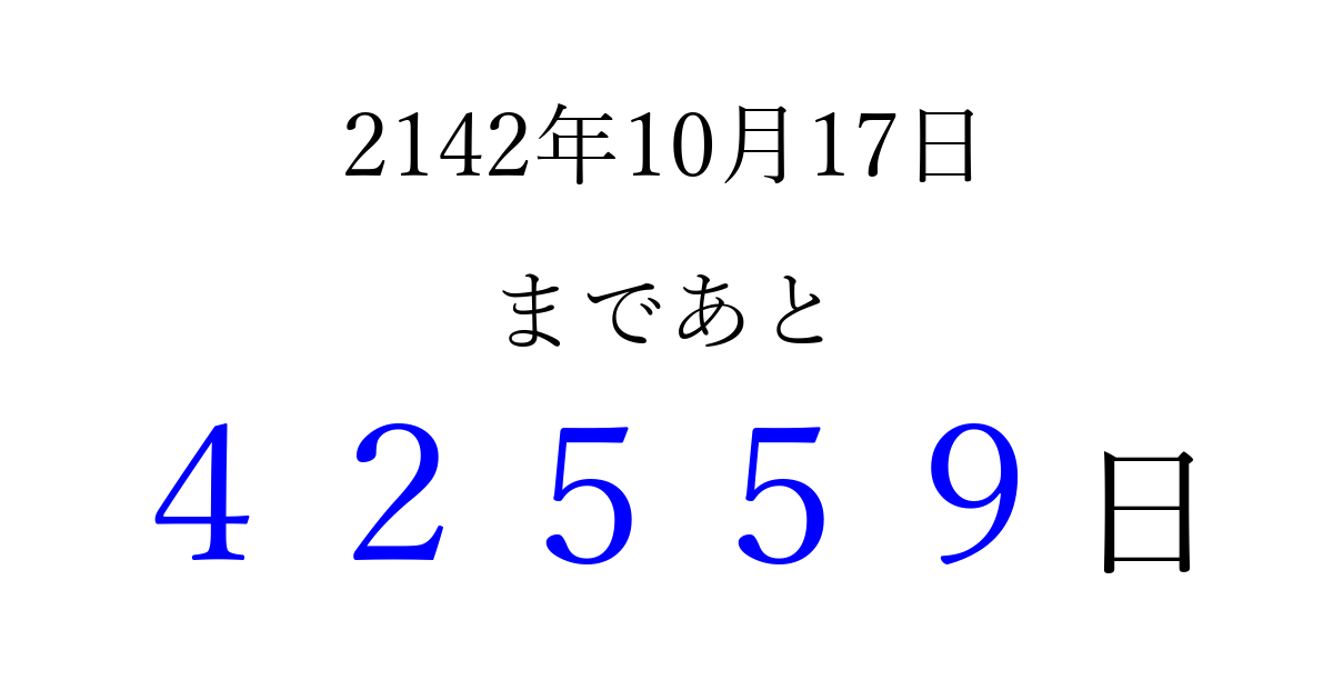 2142年10月17日(水)まで あと 99999 日です 追加すると、トップページからすぐ選べるようになります ※2026/04/09現在の結果です。 最新の状態に更新する ↓シェアして、タイムライン上にカウントダウンを表示しよう!↓ 📤 この結果を共有する Tweet シェア Threads Bluesky 別の日付でカウントダウン 2142年10月のカレンダー このページをブックマークに追加すると、いつでもカウントダウンを確認できます。 (PC: Ctrl+D / Mac: ⌘+D) hitome-notes.comでは以下のページも運営しています。 指定日と期間から日付を計算 | ガチャ確率計算・シミュレーション | プライバシー・ポリシー 運営者:Avocado