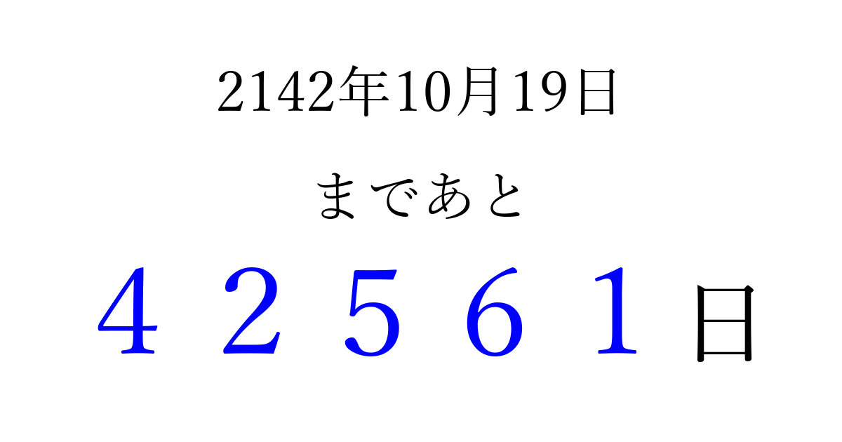 2142年10月19日(金)まで あと 99999 日です 追加すると、トップページからすぐ選べるようになります ※2026/04/09現在の結果です。 最新の状態に更新する ↓シェアして、タイムライン上にカウントダウンを表示しよう!↓ 📤 この結果を共有する Tweet シェア Threads Bluesky 別の日付でカウントダウン 2142年10月のカレンダー このページをブックマークに追加すると、いつでもカウントダウンを確認できます。 (PC: Ctrl+D / Mac: ⌘+D) hitome-notes.comでは以下のページも運営しています。 指定日と期間から日付を計算 | ガチャ確率計算・シミュレーション | プライバシー・ポリシー 運営者:Avocado