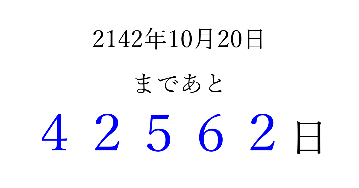 2142年10月20日(土)まで あと 99999 日です 追加すると、トップページからすぐ選べるようになります ※2026/04/09現在の結果です。 最新の状態に更新する ↓シェアして、タイムライン上にカウントダウンを表示しよう!↓ 📤 この結果を共有する Tweet シェア Threads Bluesky 別の日付でカウントダウン 2142年10月のカレンダー このページをブックマークに追加すると、いつでもカウントダウンを確認できます。 (PC: Ctrl+D / Mac: ⌘+D) hitome-notes.comでは以下のページも運営しています。 指定日と期間から日付を計算 | ガチャ確率計算・シミュレーション | プライバシー・ポリシー 運営者:Avocado