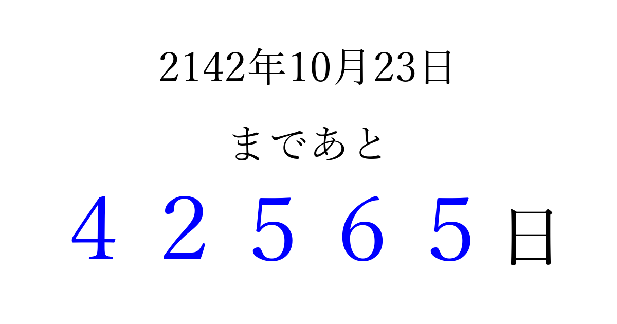 2142年10月23日(火)まで あと 99999 日です 追加すると、トップページからすぐ選べるようになります ※2026/04/09現在の結果です。 最新の状態に更新する ↓シェアして、タイムライン上にカウントダウンを表示しよう!↓ 📤 この結果を共有する Tweet シェア Threads Bluesky 別の日付でカウントダウン 2142年10月のカレンダー このページをブックマークに追加すると、いつでもカウントダウンを確認できます。 (PC: Ctrl+D / Mac: ⌘+D) hitome-notes.comでは以下のページも運営しています。 指定日と期間から日付を計算 | ガチャ確率計算・シミュレーション | プライバシー・ポリシー 運営者:Avocado