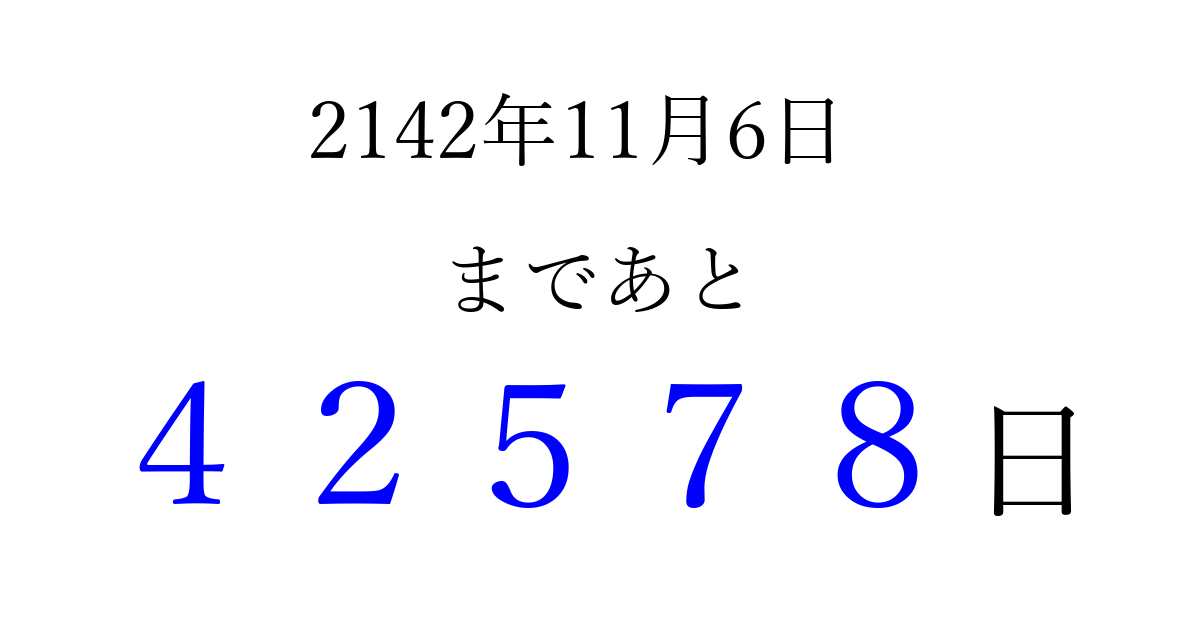 2142年11月6日(火)まで あと 99999 日です 追加すると、トップページからすぐ選べるようになります ※2026/04/10現在の結果です。 最新の状態に更新する ↓シェアして、タイムライン上にカウントダウンを表示しよう!↓ 📤 この結果を共有する Tweet シェア Threads Bluesky 別の日付でカウントダウン 2142年11月のカレンダー このページをブックマークに追加すると、いつでもカウントダウンを確認できます。 (PC: Ctrl+D / Mac: ⌘+D) hitome-notes.comでは以下のページも運営しています。 指定日と期間から日付を計算 | ガチャ確率計算・シミュレーション | プライバシー・ポリシー 運営者:Avocado