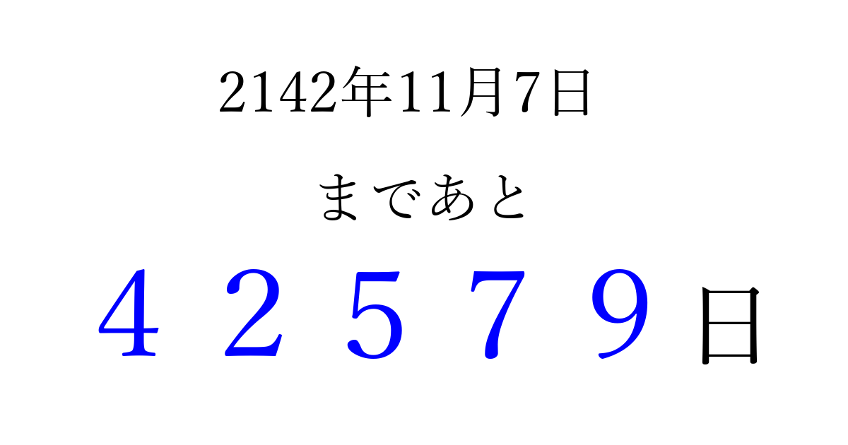 2142年11月7日(水)まで あと 99999 日です 追加すると、トップページからすぐ選べるようになります ※2026/04/10現在の結果です。 最新の状態に更新する ↓シェアして、タイムライン上にカウントダウンを表示しよう!↓ 📤 この結果を共有する Tweet シェア Threads Bluesky 別の日付でカウントダウン 2142年11月のカレンダー このページをブックマークに追加すると、いつでもカウントダウンを確認できます。 (PC: Ctrl+D / Mac: ⌘+D) hitome-notes.comでは以下のページも運営しています。 指定日と期間から日付を計算 | ガチャ確率計算・シミュレーション | プライバシー・ポリシー 運営者:Avocado