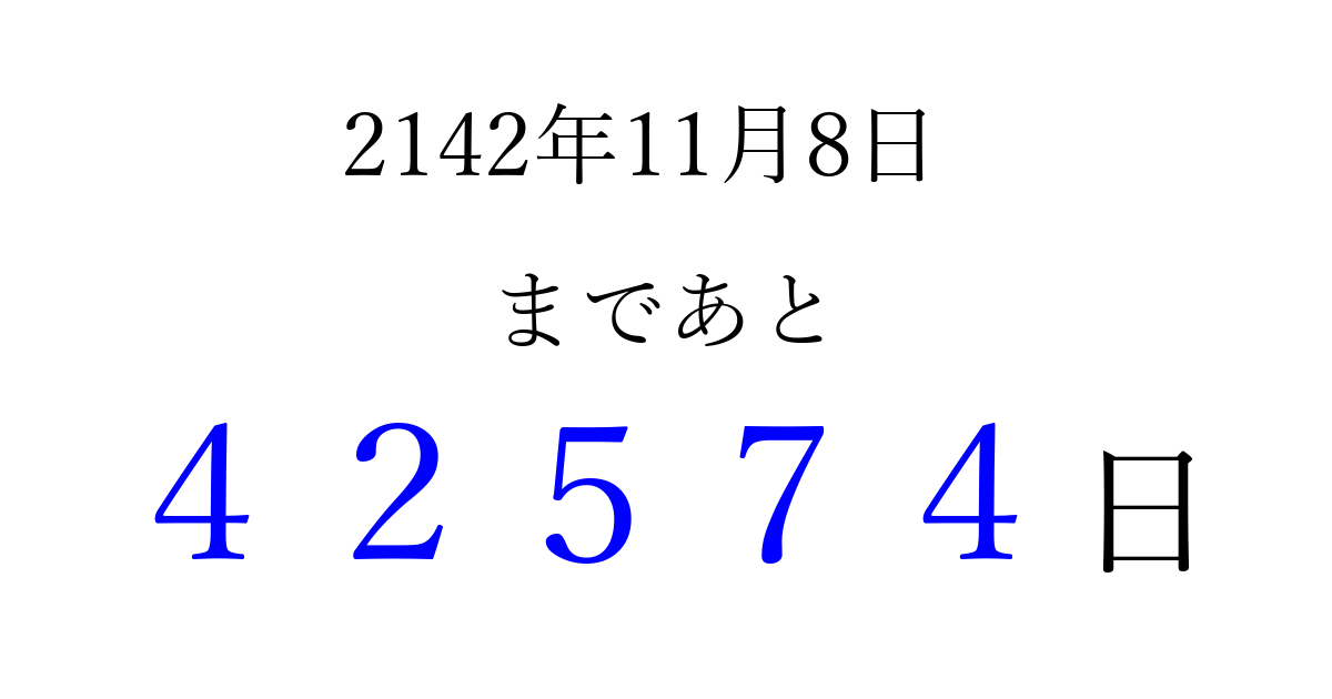 2142年11月8日(木)まで あと 99999 日です 追加すると、トップページからすぐ選べるようになります ※2026/04/16現在の結果です。 最新の状態に更新する ↓シェアして、タイムライン上にカウントダウンを表示しよう!↓ 📤 この結果を共有する Tweet シェア Threads Bluesky 別の日付でカウントダウン 2142年11月のカレンダー このページをブックマークに追加すると、いつでもカウントダウンを確認できます。 (PC: Ctrl+D / Mac: ⌘+D) hitome-notes.comでは以下のページも運営しています。 指定日と期間から日付を計算 | ガチャ確率計算・シミュレーション | プライバシー・ポリシー 運営者:Avocado