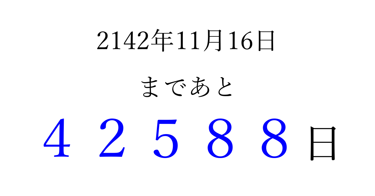 2142年11月16日(金)まで あと 99999 日です 追加すると、トップページからすぐ選べるようになります ※2026/04/10現在の結果です。 最新の状態に更新する ↓シェアして、タイムライン上にカウントダウンを表示しよう!↓ 📤 この結果を共有する Tweet シェア Threads Bluesky 別の日付でカウントダウン 2142年11月のカレンダー このページをブックマークに追加すると、いつでもカウントダウンを確認できます。 (PC: Ctrl+D / Mac: ⌘+D) hitome-notes.comでは以下のページも運営しています。 指定日と期間から日付を計算 | ガチャ確率計算・シミュレーション | プライバシー・ポリシー 運営者:Avocado
