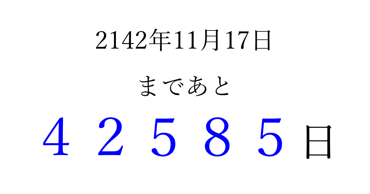 2142年11月17日(土)まで あと 99999 日です 追加すると、トップページからすぐ選べるようになります ※2026/04/14現在の結果です。 最新の状態に更新する ↓シェアして、タイムライン上にカウントダウンを表示しよう!↓ 📤 この結果を共有する Tweet シェア Threads Bluesky 別の日付でカウントダウン 2142年11月のカレンダー このページをブックマークに追加すると、いつでもカウントダウンを確認できます。 (PC: Ctrl+D / Mac: ⌘+D) hitome-notes.comでは以下のページも運営しています。 指定日と期間から日付を計算 | ガチャ確率計算・シミュレーション | プライバシー・ポリシー 運営者:Avocado