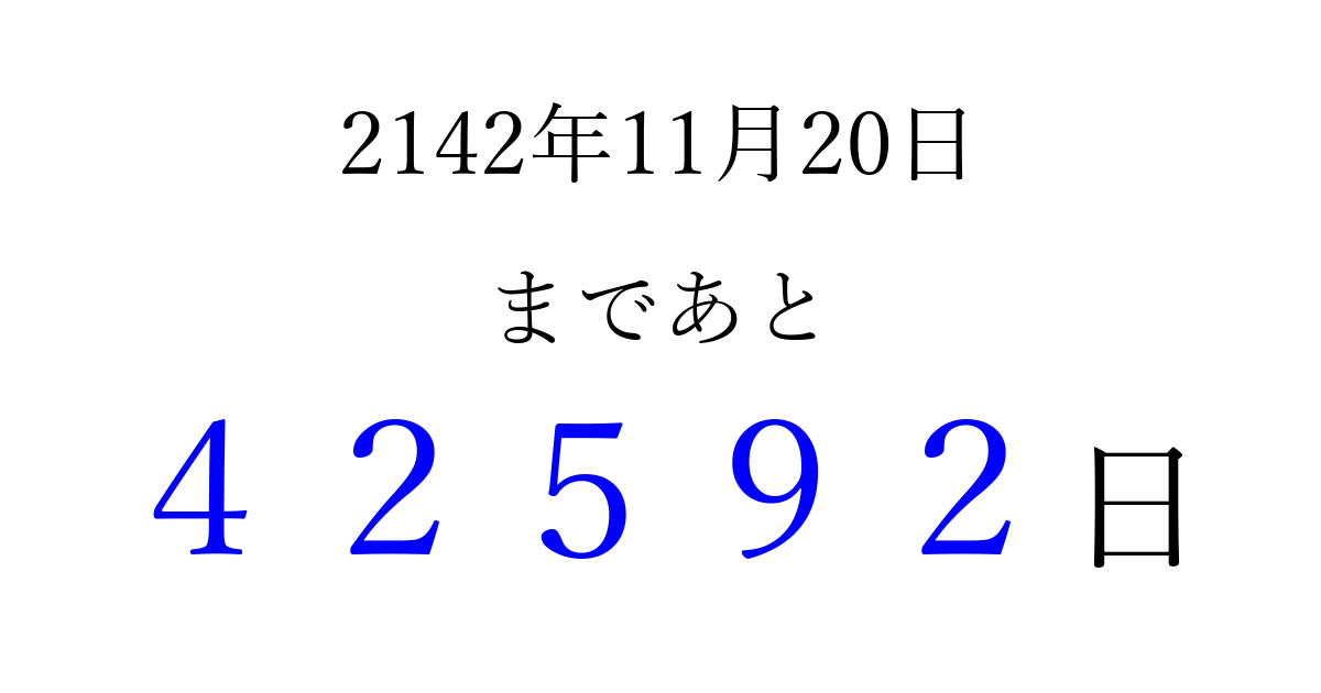 2142年11月20日(火)まで あと 99999 日です 追加すると、トップページからすぐ選べるようになります ※2026/04/10現在の結果です。 最新の状態に更新する ↓シェアして、タイムライン上にカウントダウンを表示しよう!↓ 📤 この結果を共有する Tweet シェア Threads Bluesky 別の日付でカウントダウン 2142年11月のカレンダー このページをブックマークに追加すると、いつでもカウントダウンを確認できます。 (PC: Ctrl+D / Mac: ⌘+D) hitome-notes.comでは以下のページも運営しています。 指定日と期間から日付を計算 | ガチャ確率計算・シミュレーション | プライバシー・ポリシー 運営者:Avocado