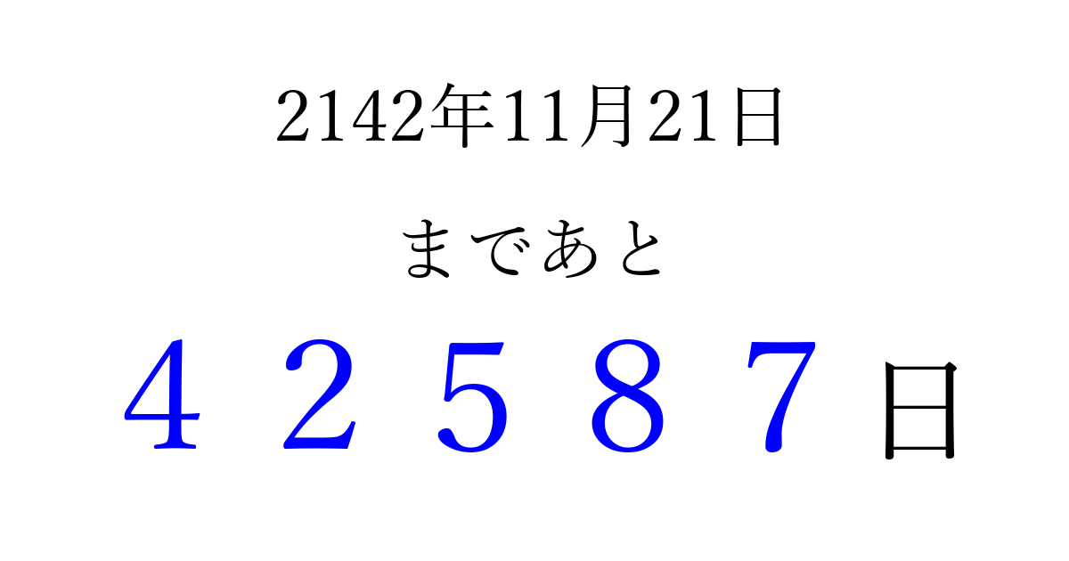 2142年11月21日(水)まで あと 99999 日です 追加すると、トップページからすぐ選べるようになります ※2026/04/16現在の結果です。 最新の状態に更新する ↓シェアして、タイムライン上にカウントダウンを表示しよう!↓ 📤 この結果を共有する Tweet シェア Threads Bluesky 別の日付でカウントダウン 2142年11月のカレンダー このページをブックマークに追加すると、いつでもカウントダウンを確認できます。 (PC: Ctrl+D / Mac: ⌘+D) hitome-notes.comでは以下のページも運営しています。 指定日と期間から日付を計算 | ガチャ確率計算・シミュレーション | プライバシー・ポリシー 運営者:Avocado