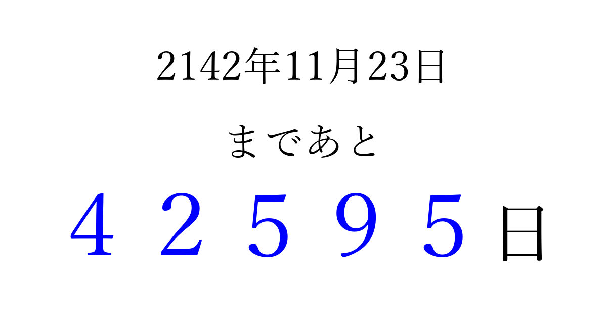 2142年11月23日(金)まで あと 99999 日です 追加すると、トップページからすぐ選べるようになります ※2026/04/10現在の結果です。 最新の状態に更新する ↓シェアして、タイムライン上にカウントダウンを表示しよう!↓ 📤 この結果を共有する Tweet シェア Threads Bluesky 別の日付でカウントダウン 2142年11月のカレンダー このページをブックマークに追加すると、いつでもカウントダウンを確認できます。 (PC: Ctrl+D / Mac: ⌘+D) hitome-notes.comでは以下のページも運営しています。 指定日と期間から日付を計算 | ガチャ確率計算・シミュレーション | プライバシー・ポリシー 運営者:Avocado