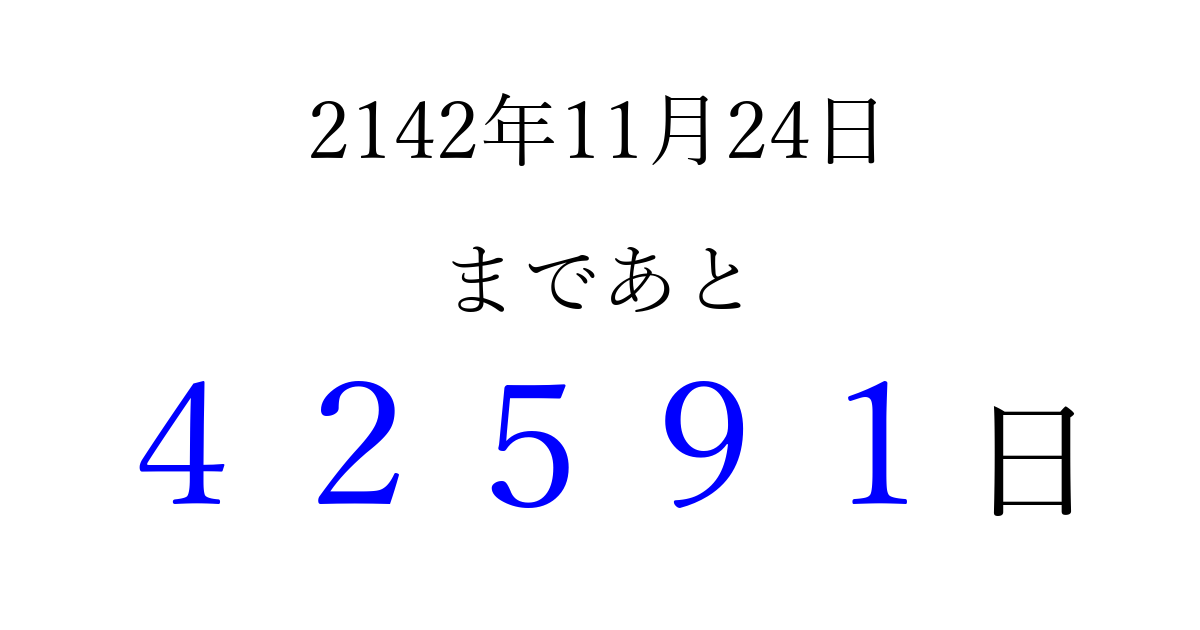 2142年11月24日(土)まで あと 99999 日です 追加すると、トップページからすぐ選べるようになります ※2026/04/15現在の結果です。 最新の状態に更新する ↓シェアして、タイムライン上にカウントダウンを表示しよう!↓ 📤 この結果を共有する Tweet シェア Threads Bluesky 別の日付でカウントダウン 2142年11月のカレンダー このページをブックマークに追加すると、いつでもカウントダウンを確認できます。 (PC: Ctrl+D / Mac: ⌘+D) hitome-notes.comでは以下のページも運営しています。 指定日と期間から日付を計算 | ガチャ確率計算・シミュレーション | プライバシー・ポリシー 運営者:Avocado