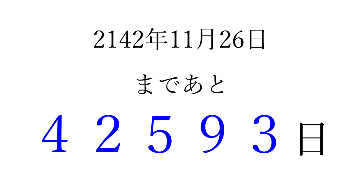 2142年11月26日(月)まで あと 99999 日です 追加すると、トップページからすぐ選べるようになります ※2026/04/15現在の結果です。 最新の状態に更新する ↓シェアして、タイムライン上にカウントダウンを表示しよう!↓ 📤 この結果を共有する Tweet シェア Threads Bluesky 別の日付でカウントダウン 2142年11月のカレンダー このページをブックマークに追加すると、いつでもカウントダウンを確認できます。 (PC: Ctrl+D / Mac: ⌘+D) hitome-notes.comでは以下のページも運営しています。 指定日と期間から日付を計算 | ガチャ確率計算・シミュレーション | プライバシー・ポリシー 運営者:Avocado