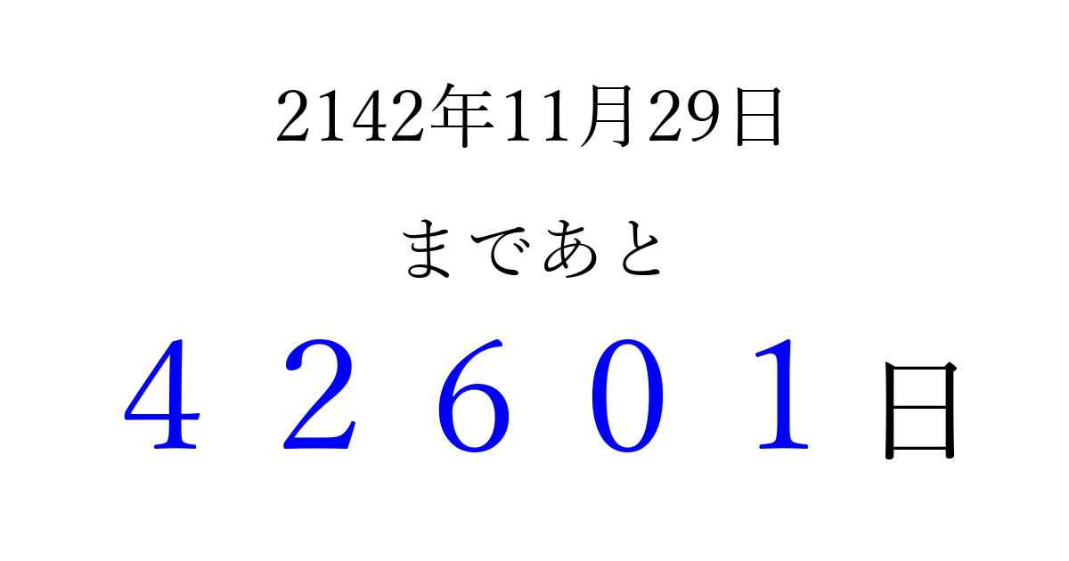 2142年11月29日(木)まで あと 99999 日です 追加すると、トップページからすぐ選べるようになります ※2026/04/10現在の結果です。 最新の状態に更新する ↓シェアして、タイムライン上にカウントダウンを表示しよう!↓ 📤 この結果を共有する Tweet シェア Threads Bluesky 別の日付でカウントダウン 2142年11月のカレンダー このページをブックマークに追加すると、いつでもカウントダウンを確認できます。 (PC: Ctrl+D / Mac: ⌘+D) hitome-notes.comでは以下のページも運営しています。 指定日と期間から日付を計算 | ガチャ確率計算・シミュレーション | プライバシー・ポリシー 運営者:Avocado