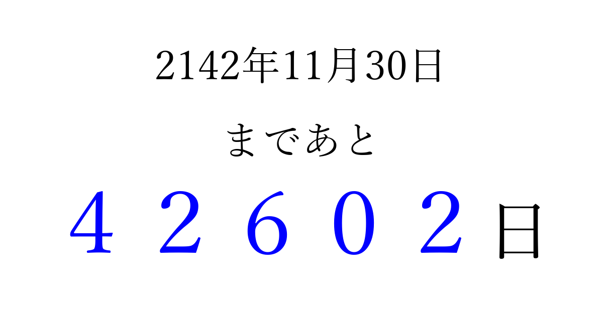 2142年11月30日(金)まで あと 99999 日です 追加すると、トップページからすぐ選べるようになります ※2026/04/10現在の結果です。 最新の状態に更新する ↓シェアして、タイムライン上にカウントダウンを表示しよう!↓ 📤 この結果を共有する Tweet シェア Threads Bluesky 別の日付でカウントダウン 2142年11月のカレンダー このページをブックマークに追加すると、いつでもカウントダウンを確認できます。 (PC: Ctrl+D / Mac: ⌘+D) hitome-notes.comでは以下のページも運営しています。 指定日と期間から日付を計算 | ガチャ確率計算・シミュレーション | プライバシー・ポリシー 運営者:Avocado