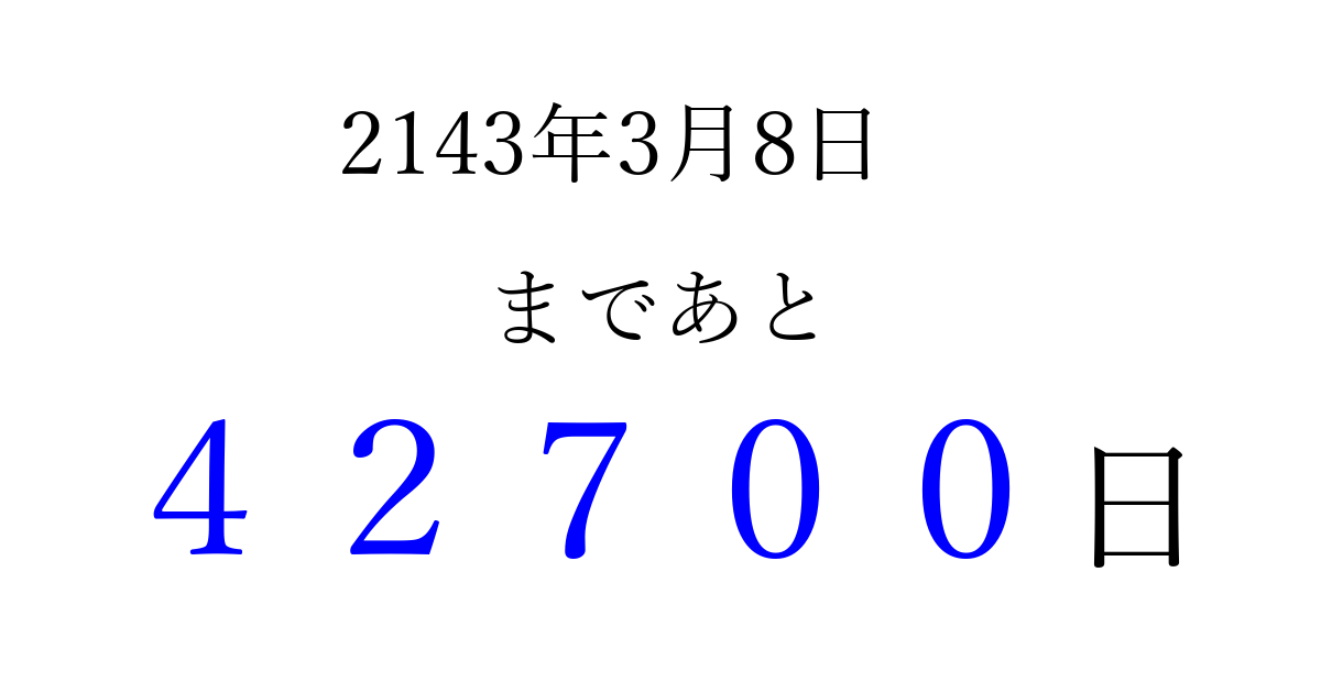 2143年3月8日(金)まで あと 99999 日です 追加すると、トップページからすぐ選べるようになります ※2026/04/10現在の結果です。 最新の状態に更新する ↓シェアして、タイムライン上にカウントダウンを表示しよう!↓ 📤 この結果を共有する Tweet シェア Threads Bluesky 別の日付でカウントダウン 2143年3月のカレンダー このページをブックマークに追加すると、いつでもカウントダウンを確認できます。 (PC: Ctrl+D / Mac: ⌘+D) hitome-notes.comでは以下のページも運営しています。 指定日と期間から日付を計算 | ガチャ確率計算・シミュレーション | プライバシー・ポリシー 運営者:Avocado