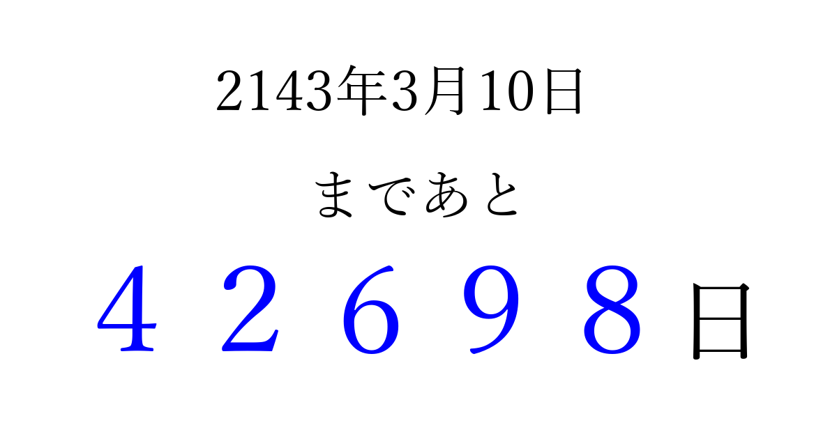 2143年3月10日(日)まで あと 99999 日です 追加すると、トップページからすぐ選べるようになります ※2026/04/14現在の結果です。 最新の状態に更新する ↓シェアして、タイムライン上にカウントダウンを表示しよう!↓ 📤 この結果を共有する Tweet シェア Threads Bluesky 別の日付でカウントダウン 2143年3月のカレンダー このページをブックマークに追加すると、いつでもカウントダウンを確認できます。 (PC: Ctrl+D / Mac: ⌘+D) hitome-notes.comでは以下のページも運営しています。 指定日と期間から日付を計算 | ガチャ確率計算・シミュレーション | プライバシー・ポリシー 運営者:Avocado