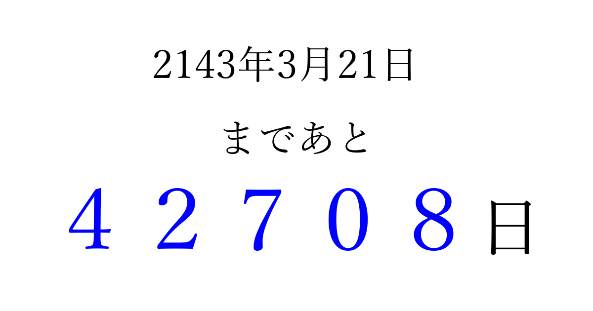 2143年3月21日(木)まで あと 99999 日です 追加すると、トップページからすぐ選べるようになります ※2026/04/15現在の結果です。 最新の状態に更新する ↓シェアして、タイムライン上にカウントダウンを表示しよう!↓ 📤 この結果を共有する Tweet シェア Threads Bluesky 別の日付でカウントダウン 2143年3月のカレンダー このページをブックマークに追加すると、いつでもカウントダウンを確認できます。 (PC: Ctrl+D / Mac: ⌘+D) hitome-notes.comでは以下のページも運営しています。 指定日と期間から日付を計算 | ガチャ確率計算・シミュレーション | プライバシー・ポリシー 運営者:Avocado