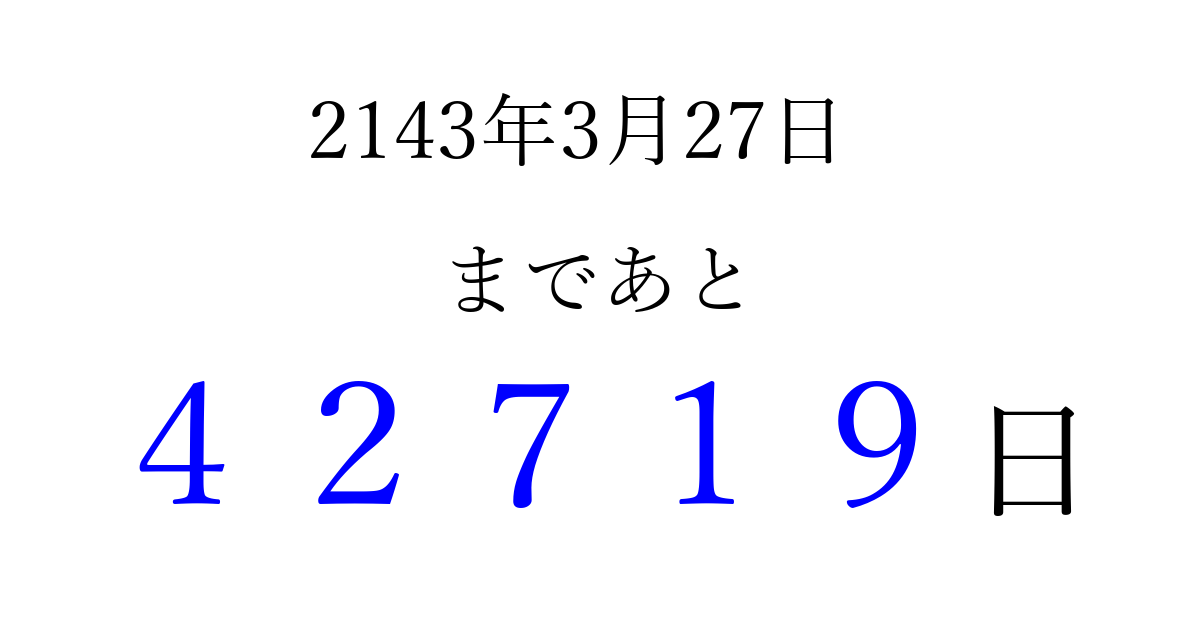 2143年3月27日(水)まで あと 99999 日です 追加すると、トップページからすぐ選べるようになります ※2026/04/10現在の結果です。 最新の状態に更新する ↓シェアして、タイムライン上にカウントダウンを表示しよう!↓ 📤 この結果を共有する Tweet シェア Threads Bluesky 別の日付でカウントダウン 2143年3月のカレンダー このページをブックマークに追加すると、いつでもカウントダウンを確認できます。 (PC: Ctrl+D / Mac: ⌘+D) hitome-notes.comでは以下のページも運営しています。 指定日と期間から日付を計算 | ガチャ確率計算・シミュレーション | プライバシー・ポリシー 運営者:Avocado