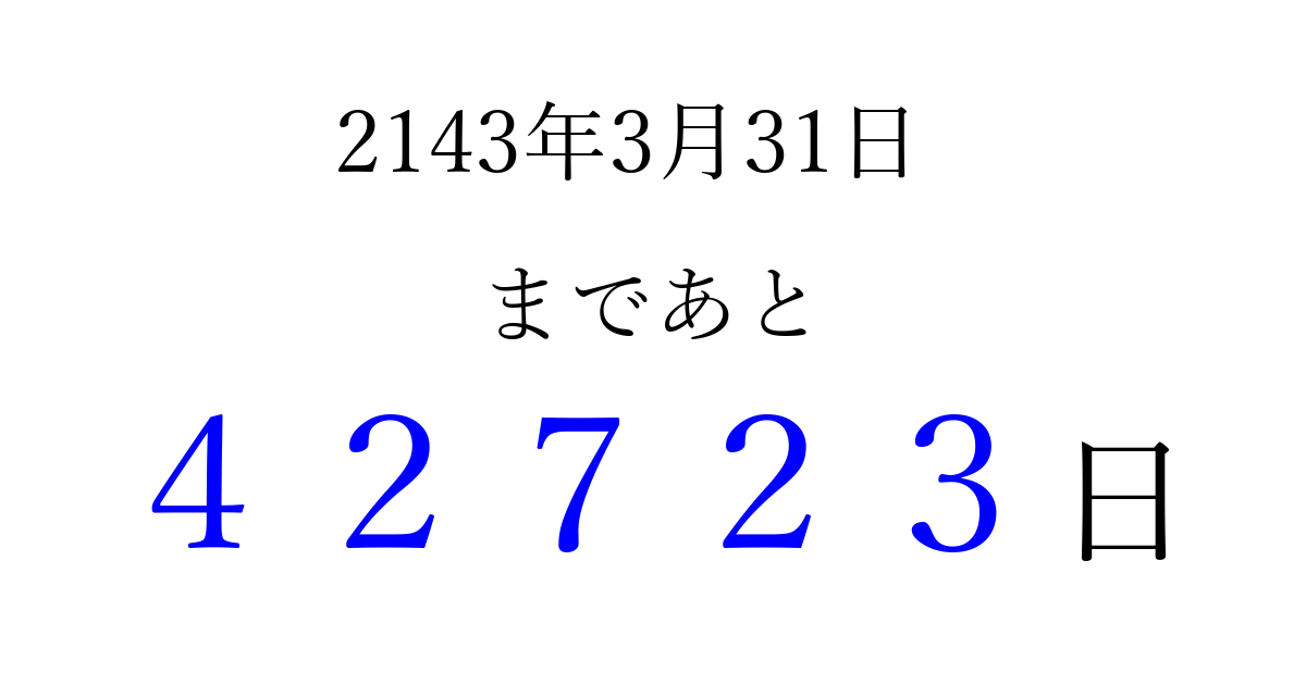 2143年3月31日(日)まで あと 99999 日です 追加すると、トップページからすぐ選べるようになります ※2026/04/10現在の結果です。 最新の状態に更新する ↓シェアして、タイムライン上にカウントダウンを表示しよう!↓ 📤 この結果を共有する Tweet シェア Threads Bluesky 別の日付でカウントダウン 2143年3月のカレンダー このページをブックマークに追加すると、いつでもカウントダウンを確認できます。 (PC: Ctrl+D / Mac: ⌘+D) hitome-notes.comでは以下のページも運営しています。 指定日と期間から日付を計算 | ガチャ確率計算・シミュレーション | プライバシー・ポリシー 運営者:Avocado