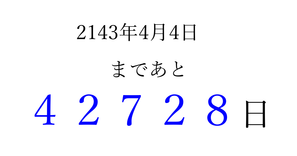 2143年4月4日(木)まで あと 99999 日です 追加すると、トップページからすぐ選べるようになります ※2026/04/09現在の結果です。 最新の状態に更新する ↓シェアして、タイムライン上にカウントダウンを表示しよう!↓ 📤 この結果を共有する Tweet シェア Threads Bluesky 別の日付でカウントダウン 2143年4月のカレンダー このページをブックマークに追加すると、いつでもカウントダウンを確認できます。 (PC: Ctrl+D / Mac: ⌘+D) hitome-notes.comでは以下のページも運営しています。 指定日と期間から日付を計算 | ガチャ確率計算・シミュレーション | プライバシー・ポリシー 運営者:Avocado