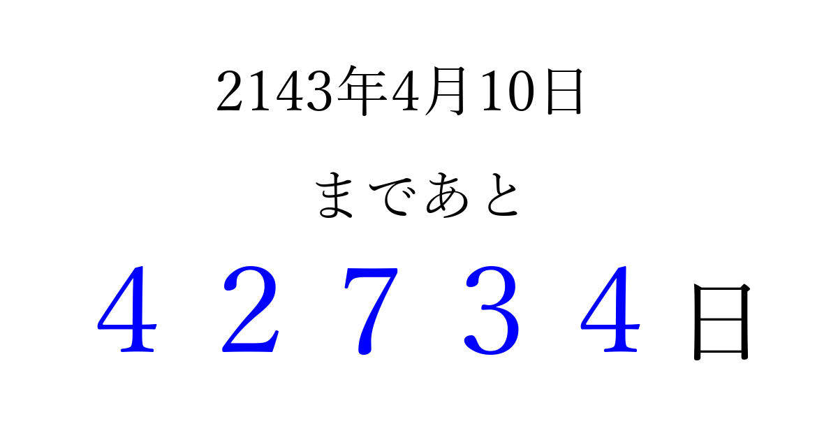 2143年4月10日(水)まで あと 99999 日です 追加すると、トップページからすぐ選べるようになります ※2026/04/09現在の結果です。 最新の状態に更新する ↓シェアして、タイムライン上にカウントダウンを表示しよう!↓ 📤 この結果を共有する Tweet シェア Threads Bluesky 別の日付でカウントダウン 2143年4月のカレンダー このページをブックマークに追加すると、いつでもカウントダウンを確認できます。 (PC: Ctrl+D / Mac: ⌘+D) hitome-notes.comでは以下のページも運営しています。 指定日と期間から日付を計算 | ガチャ確率計算・シミュレーション | プライバシー・ポリシー 運営者:Avocado