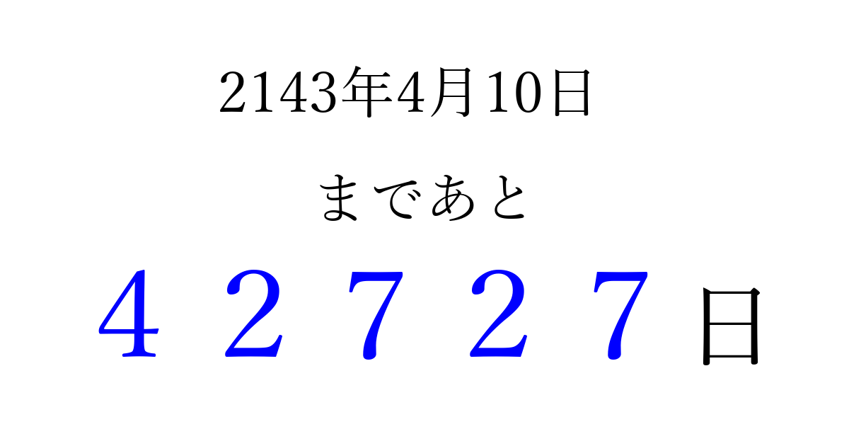 2143年4月10日(水)まで あと 99999 日です 追加すると、トップページからすぐ選べるようになります ※2026/04/16現在の結果です。 最新の状態に更新する ↓シェアして、タイムライン上にカウントダウンを表示しよう!↓ 📤 この結果を共有する Tweet シェア Threads Bluesky 別の日付でカウントダウン 2143年4月のカレンダー このページをブックマークに追加すると、いつでもカウントダウンを確認できます。 (PC: Ctrl+D / Mac: ⌘+D) hitome-notes.comでは以下のページも運営しています。 指定日と期間から日付を計算 | ガチャ確率計算・シミュレーション | プライバシー・ポリシー 運営者:Avocado