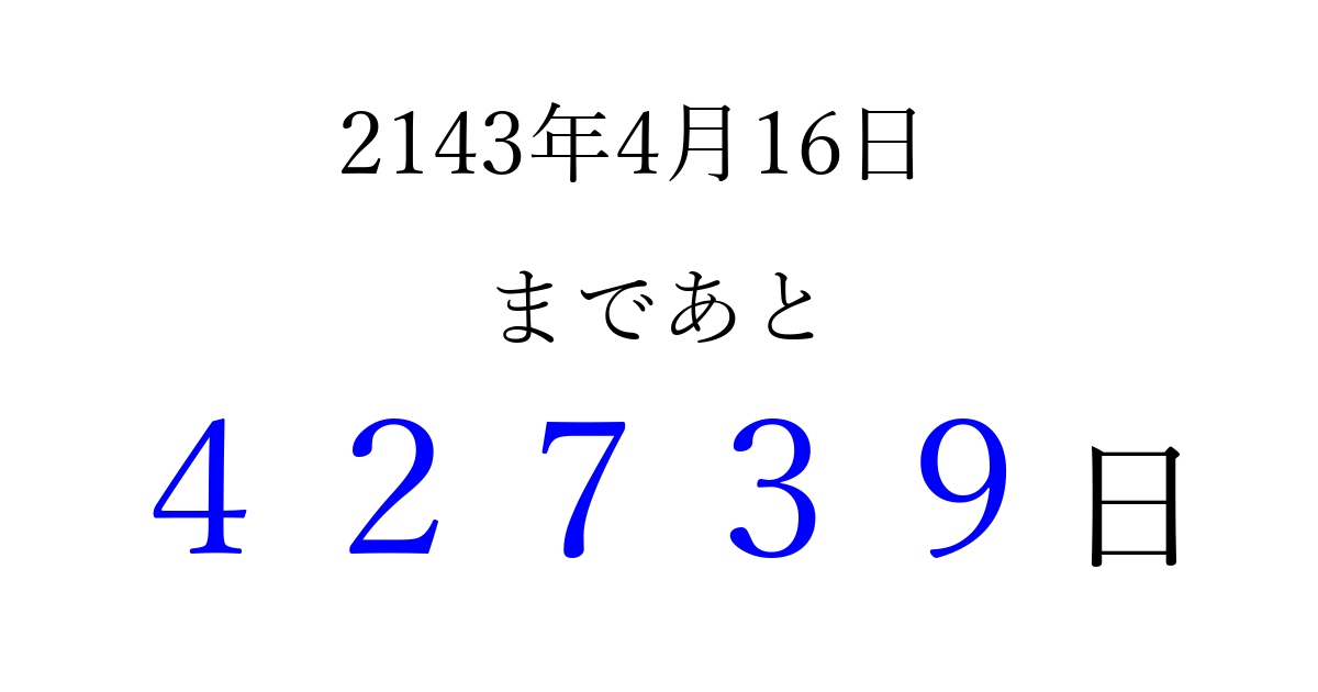 2143年4月16日(火)まで あと 99999 日です 追加すると、トップページからすぐ選べるようになります ※2026/04/10現在の結果です。 最新の状態に更新する ↓シェアして、タイムライン上にカウントダウンを表示しよう!↓ 📤 この結果を共有する Tweet シェア Threads Bluesky 別の日付でカウントダウン 2143年4月のカレンダー このページをブックマークに追加すると、いつでもカウントダウンを確認できます。 (PC: Ctrl+D / Mac: ⌘+D) hitome-notes.comでは以下のページも運営しています。 指定日と期間から日付を計算 | ガチャ確率計算・シミュレーション | プライバシー・ポリシー 運営者:Avocado