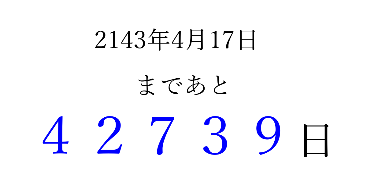 2143年4月17日(水)まで あと 99999 日です 追加すると、トップページからすぐ選べるようになります ※2026/04/11現在の結果です。 最新の状態に更新する ↓シェアして、タイムライン上にカウントダウンを表示しよう!↓ 📤 この結果を共有する Tweet シェア Threads Bluesky 別の日付でカウントダウン 2143年4月のカレンダー このページをブックマークに追加すると、いつでもカウントダウンを確認できます。 (PC: Ctrl+D / Mac: ⌘+D) hitome-notes.comでは以下のページも運営しています。 指定日と期間から日付を計算 | ガチャ確率計算・シミュレーション | プライバシー・ポリシー 運営者:Avocado