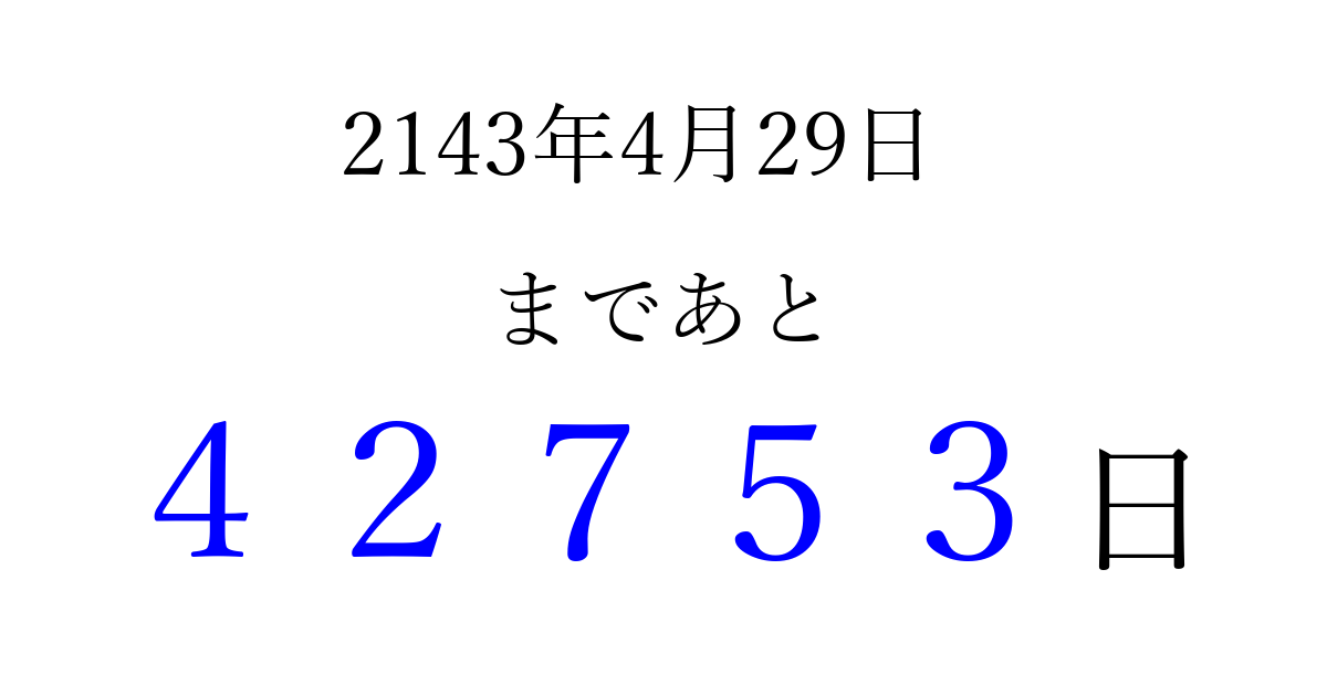 2143年4月29日(月)まで あと 99999 日です 追加すると、トップページからすぐ選べるようになります ※2026/04/09現在の結果です。 最新の状態に更新する ↓シェアして、タイムライン上にカウントダウンを表示しよう!↓ 📤 この結果を共有する Tweet シェア Threads Bluesky 別の日付でカウントダウン 2143年4月のカレンダー このページをブックマークに追加すると、いつでもカウントダウンを確認できます。 (PC: Ctrl+D / Mac: ⌘+D) hitome-notes.comでは以下のページも運営しています。 指定日と期間から日付を計算 | ガチャ確率計算・シミュレーション | プライバシー・ポリシー 運営者:Avocado