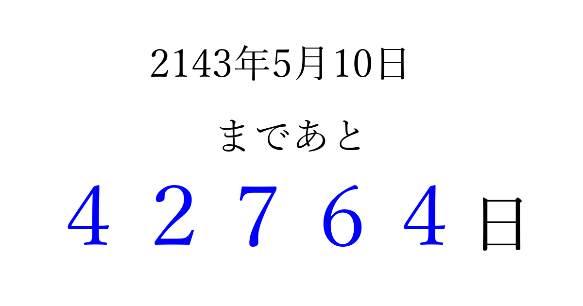 2143年5月10日(金)まで あと 99999 日です 追加すると、トップページからすぐ選べるようになります ※2026/04/09現在の結果です。 最新の状態に更新する ↓シェアして、タイムライン上にカウントダウンを表示しよう!↓ 📤 この結果を共有する Tweet シェア Threads Bluesky 別の日付でカウントダウン 2143年5月のカレンダー このページをブックマークに追加すると、いつでもカウントダウンを確認できます。 (PC: Ctrl+D / Mac: ⌘+D) hitome-notes.comでは以下のページも運営しています。 指定日と期間から日付を計算 | ガチャ確率計算・シミュレーション | プライバシー・ポリシー 運営者:Avocado