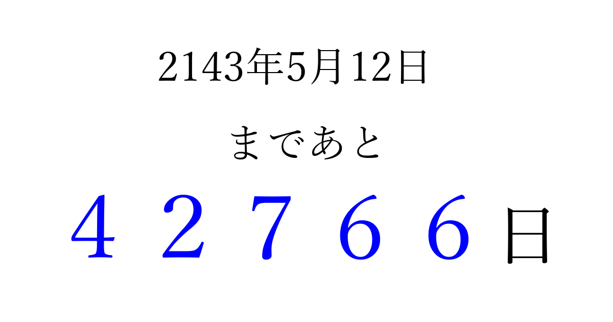 2143年5月12日(日)まで あと 99999 日です 追加すると、トップページからすぐ選べるようになります ※2026/04/09現在の結果です。 最新の状態に更新する ↓シェアして、タイムライン上にカウントダウンを表示しよう!↓ 📤 この結果を共有する Tweet シェア Threads Bluesky 別の日付でカウントダウン 2143年5月のカレンダー このページをブックマークに追加すると、いつでもカウントダウンを確認できます。 (PC: Ctrl+D / Mac: ⌘+D) hitome-notes.comでは以下のページも運営しています。 指定日と期間から日付を計算 | ガチャ確率計算・シミュレーション | プライバシー・ポリシー 運営者:Avocado
