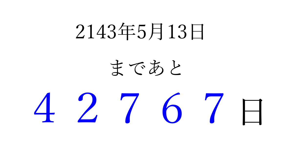 2143年5月13日(月)まで あと 99999 日です 追加すると、トップページからすぐ選べるようになります ※2026/04/09現在の結果です。 最新の状態に更新する ↓シェアして、タイムライン上にカウントダウンを表示しよう!↓ 📤 この結果を共有する Tweet シェア Threads Bluesky 別の日付でカウントダウン 2143年5月のカレンダー このページをブックマークに追加すると、いつでもカウントダウンを確認できます。 (PC: Ctrl+D / Mac: ⌘+D) hitome-notes.comでは以下のページも運営しています。 指定日と期間から日付を計算 | ガチャ確率計算・シミュレーション | プライバシー・ポリシー 運営者:Avocado