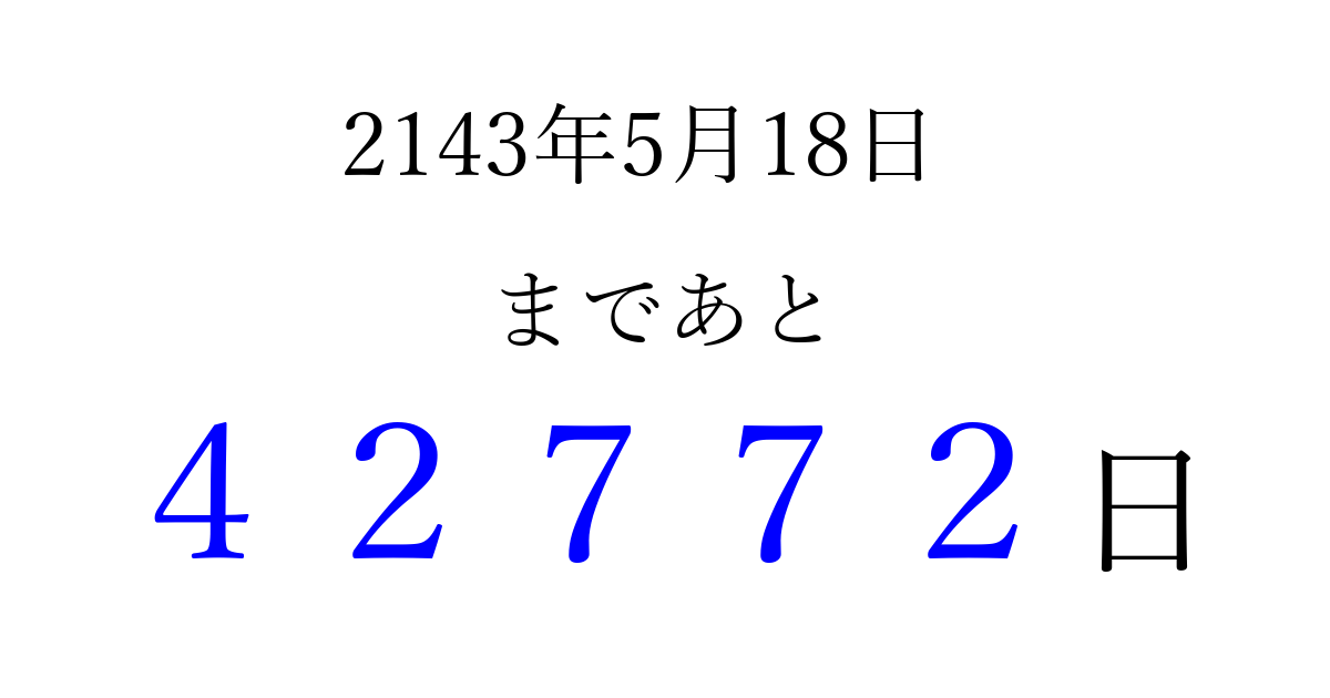 2143年5月18日(土)まで あと 99999 日です 追加すると、トップページからすぐ選べるようになります ※2026/04/09現在の結果です。 最新の状態に更新する ↓シェアして、タイムライン上にカウントダウンを表示しよう!↓ 📤 この結果を共有する Tweet シェア Threads Bluesky 別の日付でカウントダウン 2143年5月のカレンダー このページをブックマークに追加すると、いつでもカウントダウンを確認できます。 (PC: Ctrl+D / Mac: ⌘+D) hitome-notes.comでは以下のページも運営しています。 指定日と期間から日付を計算 | ガチャ確率計算・シミュレーション | プライバシー・ポリシー 運営者:Avocado