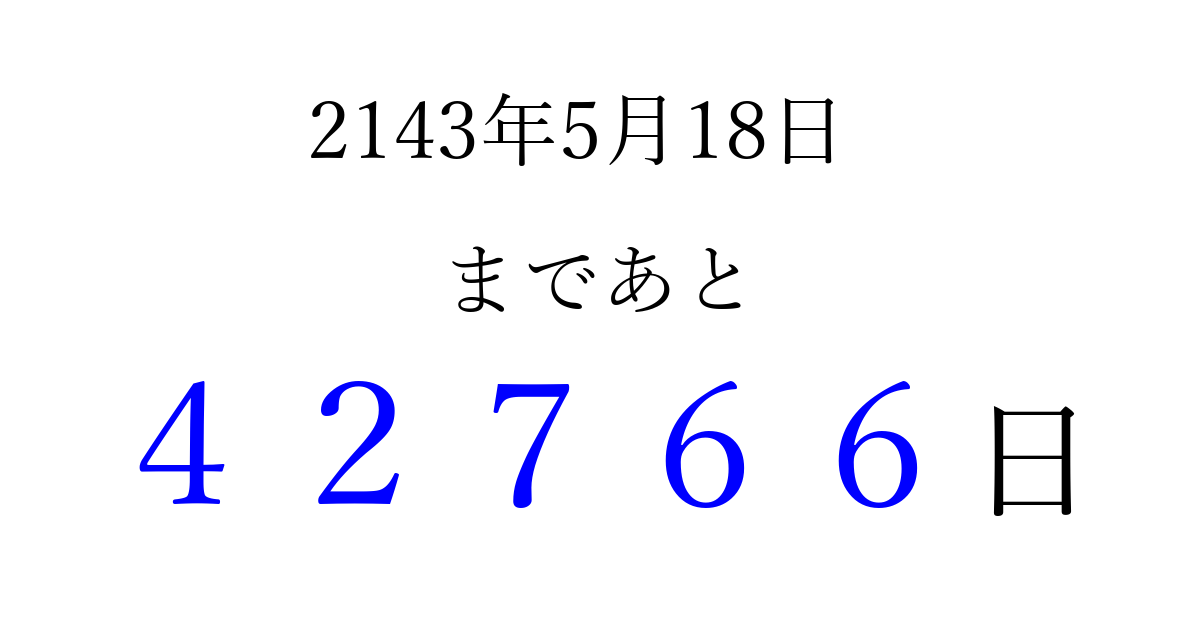 2143年5月18日(土)まで あと 99999 日です 追加すると、トップページからすぐ選べるようになります ※2026/04/15現在の結果です。 最新の状態に更新する ↓シェアして、タイムライン上にカウントダウンを表示しよう!↓ 📤 この結果を共有する Tweet シェア Threads Bluesky 別の日付でカウントダウン 2143年5月のカレンダー このページをブックマークに追加すると、いつでもカウントダウンを確認できます。 (PC: Ctrl+D / Mac: ⌘+D) hitome-notes.comでは以下のページも運営しています。 指定日と期間から日付を計算 | ガチャ確率計算・シミュレーション | プライバシー・ポリシー 運営者:Avocado