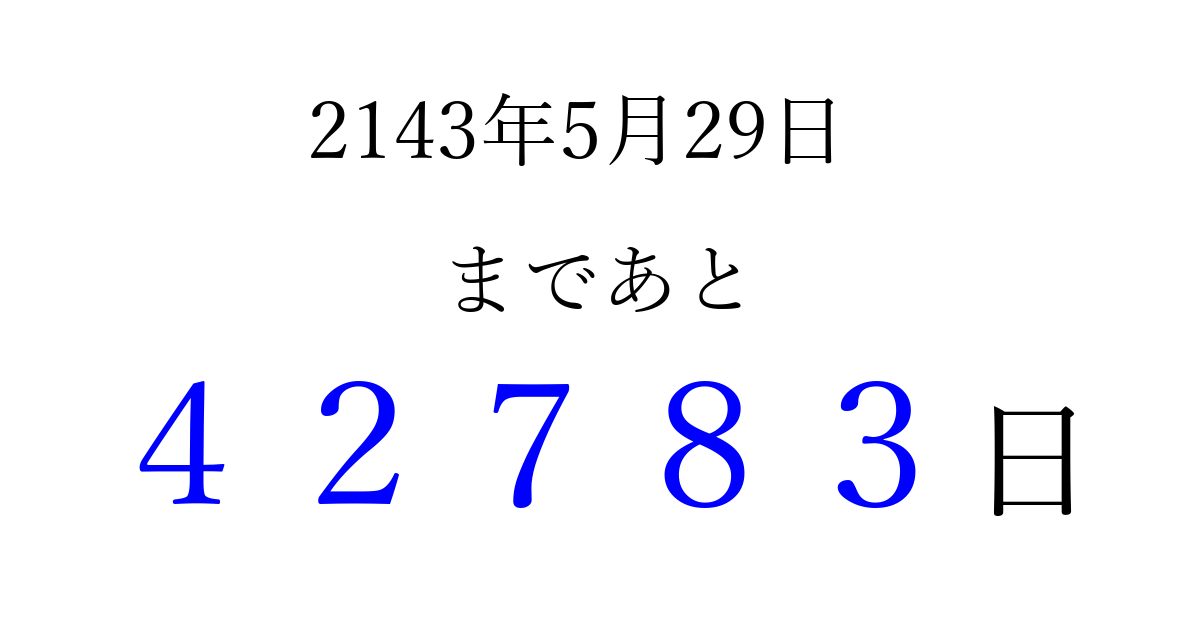 2143年5月29日(水)まで あと 99999 日です 追加すると、トップページからすぐ選べるようになります ※2026/04/09現在の結果です。 最新の状態に更新する ↓シェアして、タイムライン上にカウントダウンを表示しよう!↓ 📤 この結果を共有する Tweet シェア Threads Bluesky 別の日付でカウントダウン 2143年5月のカレンダー このページをブックマークに追加すると、いつでもカウントダウンを確認できます。 (PC: Ctrl+D / Mac: ⌘+D) hitome-notes.comでは以下のページも運営しています。 指定日と期間から日付を計算 | ガチャ確率計算・シミュレーション | プライバシー・ポリシー 運営者:Avocado
