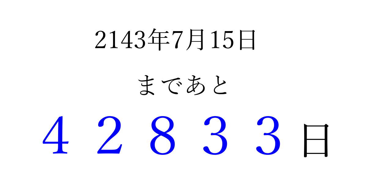 2143年7月15日(月)まで あと 99999 日です 追加すると、トップページからすぐ選べるようになります ※2026/04/06現在の結果です。 最新の状態に更新する ↓シェアして、タイムライン上にカウントダウンを表示しよう!↓ 📤 この結果を共有する Tweet シェア Threads Bluesky 別の日付でカウントダウン 2143年7月のカレンダー このページをブックマークに追加すると、いつでもカウントダウンを確認できます。 (PC: Ctrl+D / Mac: ⌘+D) hitome-notes.comでは以下のページも運営しています。 指定日と期間から日付を計算 | ガチャ確率計算・シミュレーション | プライバシー・ポリシー 運営者:Avocado
