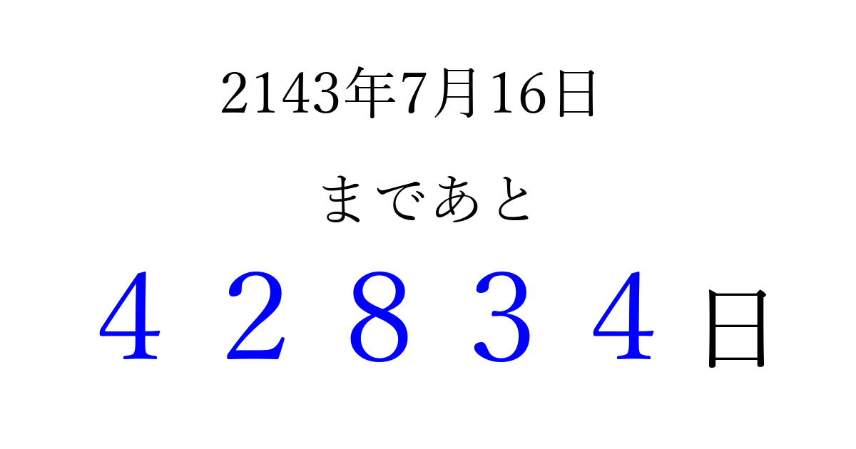 2143年7月16日(火)まで あと 99999 日です 追加すると、トップページからすぐ選べるようになります ※2026/04/06現在の結果です。 最新の状態に更新する ↓シェアして、タイムライン上にカウントダウンを表示しよう!↓ 📤 この結果を共有する Tweet シェア Threads Bluesky 別の日付でカウントダウン 2143年7月のカレンダー このページをブックマークに追加すると、いつでもカウントダウンを確認できます。 (PC: Ctrl+D / Mac: ⌘+D) hitome-notes.comでは以下のページも運営しています。 指定日と期間から日付を計算 | ガチャ確率計算・シミュレーション | プライバシー・ポリシー 運営者:Avocado
