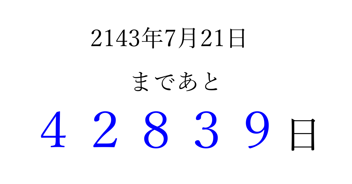 2143年7月21日(日)まで あと 99999 日です 追加すると、トップページからすぐ選べるようになります ※2026/04/06現在の結果です。 最新の状態に更新する ↓シェアして、タイムライン上にカウントダウンを表示しよう!↓ 📤 この結果を共有する Tweet シェア Threads Bluesky 別の日付でカウントダウン 2143年7月のカレンダー このページをブックマークに追加すると、いつでもカウントダウンを確認できます。 (PC: Ctrl+D / Mac: ⌘+D) hitome-notes.comでは以下のページも運営しています。 指定日と期間から日付を計算 | ガチャ確率計算・シミュレーション | プライバシー・ポリシー 運営者:Avocado