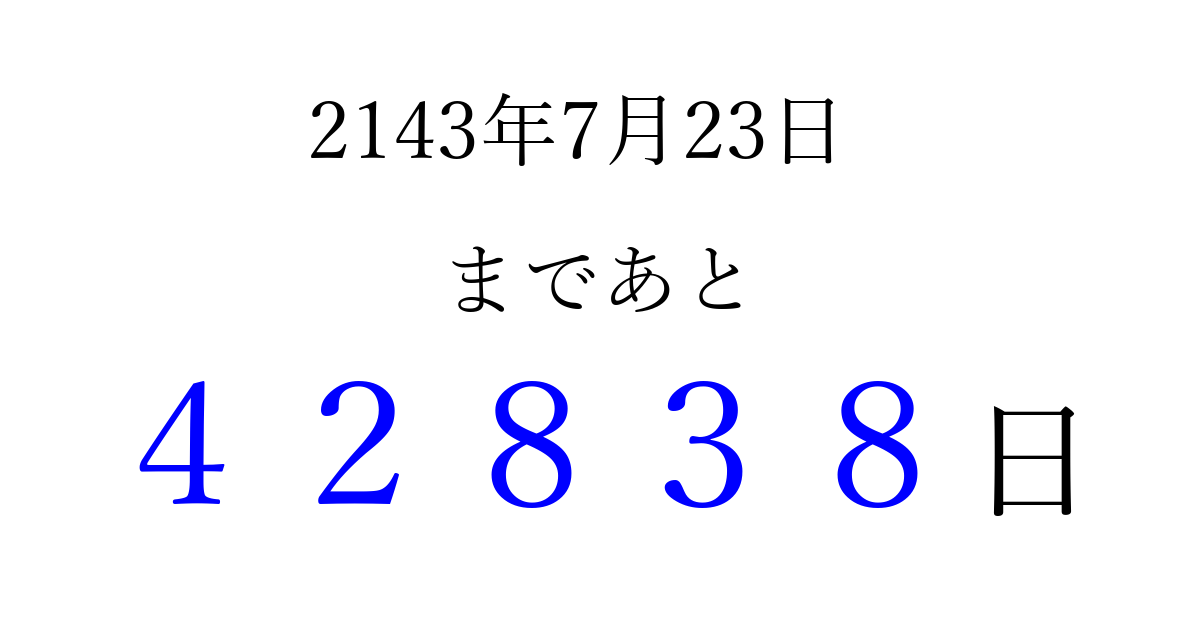 2143年7月23日(火)まで あと 99999 日です 追加すると、トップページからすぐ選べるようになります ※2026/04/09現在の結果です。 最新の状態に更新する ↓シェアして、タイムライン上にカウントダウンを表示しよう!↓ 📤 この結果を共有する Tweet シェア Threads Bluesky 別の日付でカウントダウン 2143年7月のカレンダー このページをブックマークに追加すると、いつでもカウントダウンを確認できます。 (PC: Ctrl+D / Mac: ⌘+D) hitome-notes.comでは以下のページも運営しています。 指定日と期間から日付を計算 | ガチャ確率計算・シミュレーション | プライバシー・ポリシー 運営者:Avocado