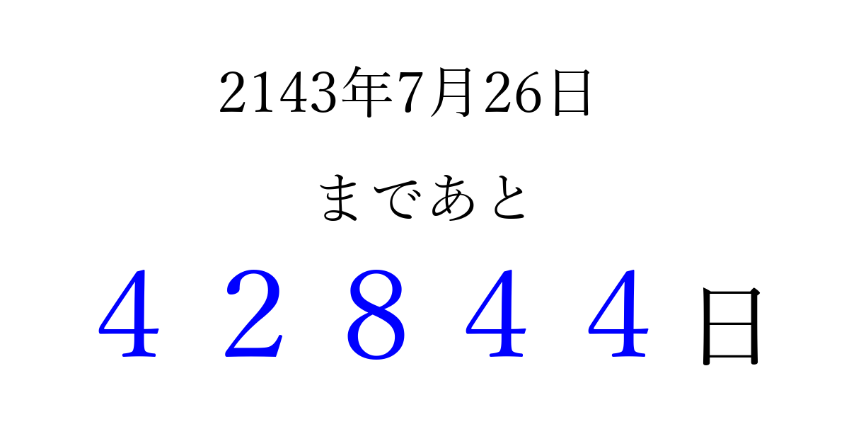 2143年7月26日(金)まで あと 99999 日です 追加すると、トップページからすぐ選べるようになります ※2026/04/06現在の結果です。 最新の状態に更新する ↓シェアして、タイムライン上にカウントダウンを表示しよう!↓ 📤 この結果を共有する Tweet シェア Threads Bluesky 別の日付でカウントダウン 2143年7月のカレンダー このページをブックマークに追加すると、いつでもカウントダウンを確認できます。 (PC: Ctrl+D / Mac: ⌘+D) hitome-notes.comでは以下のページも運営しています。 指定日と期間から日付を計算 | ガチャ確率計算・シミュレーション | プライバシー・ポリシー 運営者:Avocado