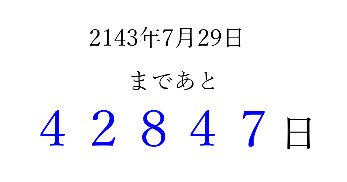 2143年7月29日(月)まで あと 99999 日です 追加すると、トップページからすぐ選べるようになります ※2026/04/06現在の結果です。 最新の状態に更新する ↓シェアして、タイムライン上にカウントダウンを表示しよう!↓ 📤 この結果を共有する Tweet シェア Threads Bluesky 別の日付でカウントダウン 2143年7月のカレンダー このページをブックマークに追加すると、いつでもカウントダウンを確認できます。 (PC: Ctrl+D / Mac: ⌘+D) hitome-notes.comでは以下のページも運営しています。 指定日と期間から日付を計算 | ガチャ確率計算・シミュレーション | プライバシー・ポリシー 運営者:Avocado