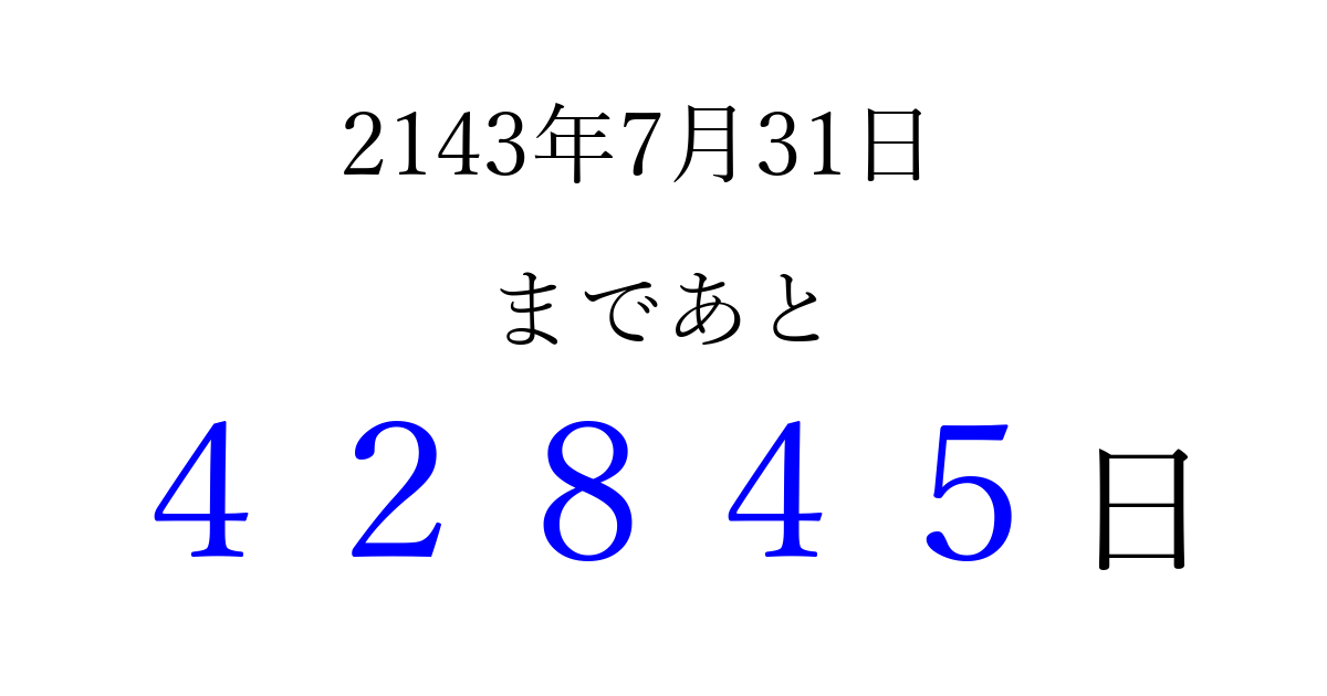 2143年7月31日(水)まで あと 99999 日です 追加すると、トップページからすぐ選べるようになります ※2026/04/10現在の結果です。 最新の状態に更新する ↓シェアして、タイムライン上にカウントダウンを表示しよう!↓ 📤 この結果を共有する Tweet シェア Threads Bluesky 別の日付でカウントダウン 2143年7月のカレンダー このページをブックマークに追加すると、いつでもカウントダウンを確認できます。 (PC: Ctrl+D / Mac: ⌘+D) hitome-notes.comでは以下のページも運営しています。 指定日と期間から日付を計算 | ガチャ確率計算・シミュレーション | プライバシー・ポリシー 運営者:Avocado