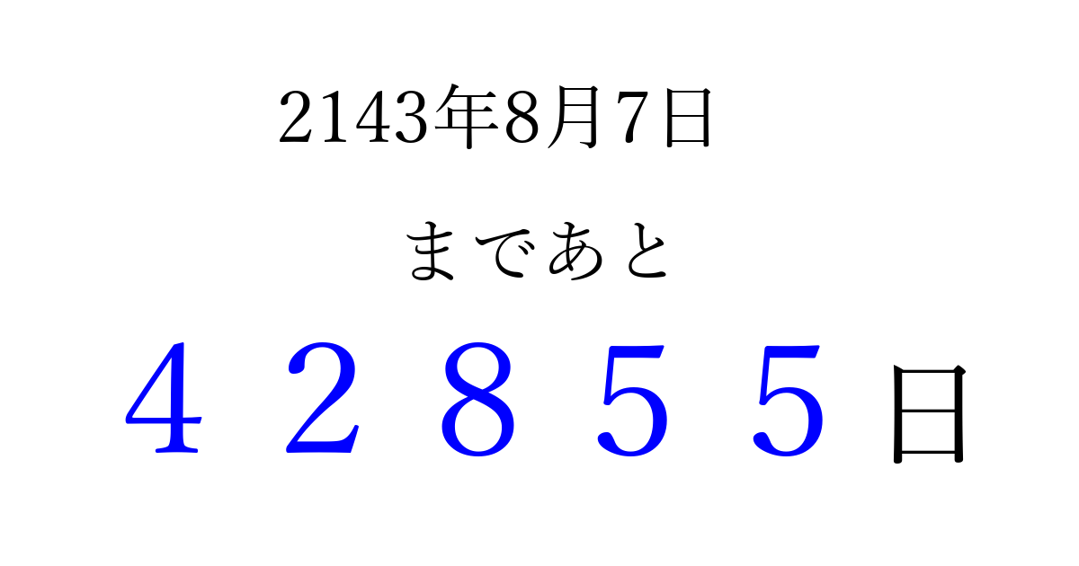 2143年8月7日(水)まで あと 99999 日です 追加すると、トップページからすぐ選べるようになります ※2026/04/07現在の結果です。 最新の状態に更新する ↓シェアして、タイムライン上にカウントダウンを表示しよう!↓ 📤 この結果を共有する Tweet シェア Threads Bluesky 別の日付でカウントダウン 2143年8月のカレンダー このページをブックマークに追加すると、いつでもカウントダウンを確認できます。 (PC: Ctrl+D / Mac: ⌘+D) hitome-notes.comでは以下のページも運営しています。 指定日と期間から日付を計算 | ガチャ確率計算・シミュレーション | プライバシー・ポリシー 運営者:Avocado