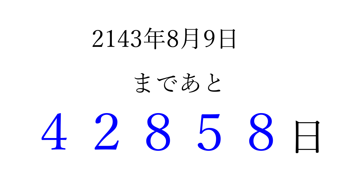 2143年8月9日(金)まで あと 99999 日です 追加すると、トップページからすぐ選べるようになります ※2026/04/06現在の結果です。 最新の状態に更新する ↓シェアして、タイムライン上にカウントダウンを表示しよう!↓ 📤 この結果を共有する Tweet シェア Threads Bluesky 別の日付でカウントダウン 2143年8月のカレンダー このページをブックマークに追加すると、いつでもカウントダウンを確認できます。 (PC: Ctrl+D / Mac: ⌘+D) hitome-notes.comでは以下のページも運営しています。 指定日と期間から日付を計算 | ガチャ確率計算・シミュレーション | プライバシー・ポリシー 運営者:Avocado