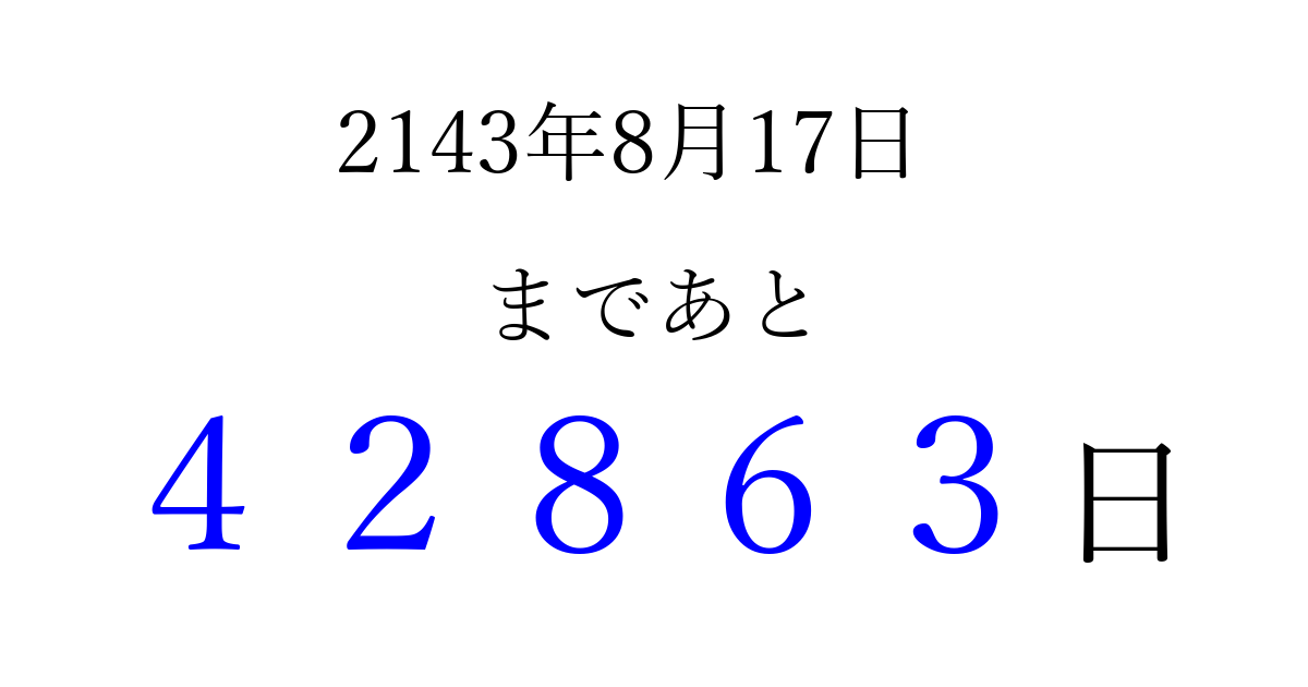 2143年8月17日(土)まで あと 99999 日です 追加すると、トップページからすぐ選べるようになります ※2026/04/09現在の結果です。 最新の状態に更新する ↓シェアして、タイムライン上にカウントダウンを表示しよう!↓ 📤 この結果を共有する Tweet シェア Threads Bluesky 別の日付でカウントダウン 2143年8月のカレンダー このページをブックマークに追加すると、いつでもカウントダウンを確認できます。 (PC: Ctrl+D / Mac: ⌘+D) hitome-notes.comでは以下のページも運営しています。 指定日と期間から日付を計算 | ガチャ確率計算・シミュレーション | プライバシー・ポリシー 運営者:Avocado
