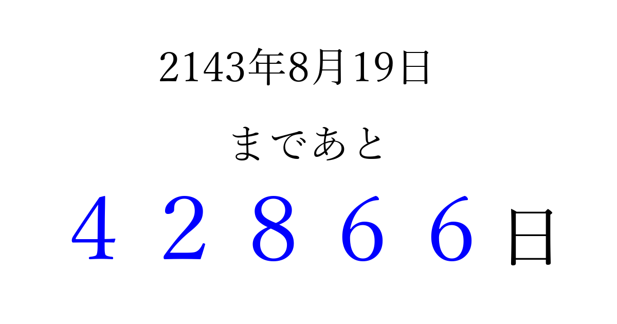 2143年8月19日(月)まで あと 99999 日です 追加すると、トップページからすぐ選べるようになります ※2026/04/08現在の結果です。 最新の状態に更新する ↓シェアして、タイムライン上にカウントダウンを表示しよう!↓ 📤 この結果を共有する Tweet シェア Threads Bluesky 別の日付でカウントダウン 2143年8月のカレンダー このページをブックマークに追加すると、いつでもカウントダウンを確認できます。 (PC: Ctrl+D / Mac: ⌘+D) hitome-notes.comでは以下のページも運営しています。 指定日と期間から日付を計算 | ガチャ確率計算・シミュレーション | プライバシー・ポリシー 運営者:Avocado