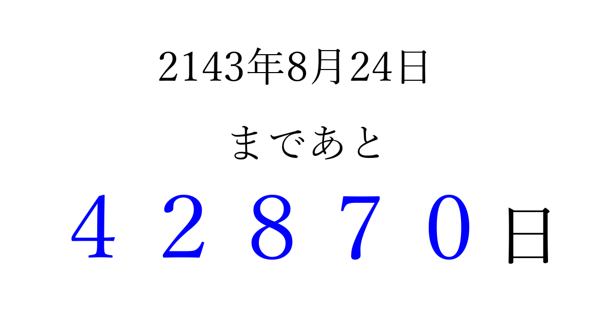 2143年8月24日(土)まで あと 99999 日です 追加すると、トップページからすぐ選べるようになります ※2026/04/09現在の結果です。 最新の状態に更新する ↓シェアして、タイムライン上にカウントダウンを表示しよう!↓ 📤 この結果を共有する Tweet シェア Threads Bluesky 別の日付でカウントダウン 2143年8月のカレンダー このページをブックマークに追加すると、いつでもカウントダウンを確認できます。 (PC: Ctrl+D / Mac: ⌘+D) hitome-notes.comでは以下のページも運営しています。 指定日と期間から日付を計算 | ガチャ確率計算・シミュレーション | プライバシー・ポリシー 運営者:Avocado