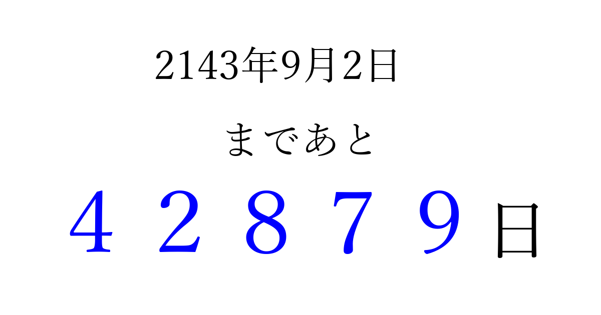 2143年9月2日(月)まで あと 99999 日です 追加すると、トップページからすぐ選べるようになります ※2026/04/09現在の結果です。 最新の状態に更新する ↓シェアして、タイムライン上にカウントダウンを表示しよう!↓ 📤 この結果を共有する Tweet シェア Threads Bluesky 別の日付でカウントダウン 2143年9月のカレンダー このページをブックマークに追加すると、いつでもカウントダウンを確認できます。 (PC: Ctrl+D / Mac: ⌘+D) hitome-notes.comでは以下のページも運営しています。 指定日と期間から日付を計算 | ガチャ確率計算・シミュレーション | プライバシー・ポリシー 運営者:Avocado