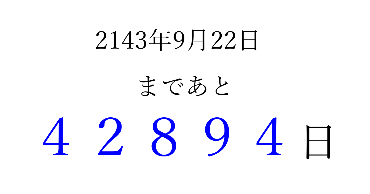 2143年9月22日(日)まで あと 99999 日です 追加すると、トップページからすぐ選べるようになります ※2026/04/14現在の結果です。 最新の状態に更新する ↓シェアして、タイムライン上にカウントダウンを表示しよう!↓ 📤 この結果を共有する Tweet シェア Threads Bluesky 別の日付でカウントダウン 2143年9月のカレンダー このページをブックマークに追加すると、いつでもカウントダウンを確認できます。 (PC: Ctrl+D / Mac: ⌘+D) hitome-notes.comでは以下のページも運営しています。 指定日と期間から日付を計算 | ガチャ確率計算・シミュレーション | プライバシー・ポリシー 運営者:Avocado
