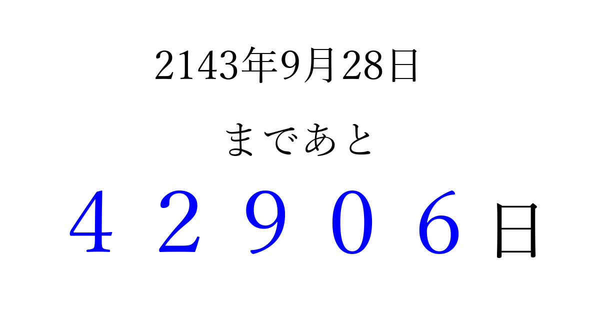 2143年9月28日(土)まで あと 99999 日です 追加すると、トップページからすぐ選べるようになります ※2026/04/08現在の結果です。 最新の状態に更新する ↓シェアして、タイムライン上にカウントダウンを表示しよう!↓ 📤 この結果を共有する Tweet シェア Threads Bluesky 別の日付でカウントダウン 2143年9月のカレンダー このページをブックマークに追加すると、いつでもカウントダウンを確認できます。 (PC: Ctrl+D / Mac: ⌘+D) hitome-notes.comでは以下のページも運営しています。 指定日と期間から日付を計算 | ガチャ確率計算・シミュレーション | プライバシー・ポリシー 運営者:Avocado